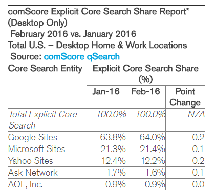 Other search engines have a minor share in global searches, including Ask Network with approximately 1,6% of market share and AOL, Inc. with less than 1% of market share, based on the same report.